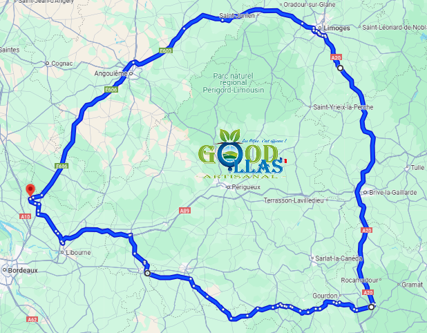 Passage à proximité de : Libourne, St Denis de Pile, St Seurin sur l’Isle, Montpon Ménstrol (Sud), St Méard de Gurçon, Le Fleix, Ste Foy la Grande, Bergerac (Sud), Issigeac, Ste Radegonde, Villeréal, Monpazier, Prats du Périgord, Marminiac, Salviac, Costeraste, Saint Clair, Pont de Rhodes, Montfaucon, Souillac , Noailles, Brives la Gaillarde, Donzenac, St Pardoux l’Ortigier, Uzerche, Masseret, Magnac-Bourg, Pierre Buffière, Limoges, St Junien, Chabanais, Chasseneuil sur Bonnieure, La Rochefoucauld en Angoumois, Angoulême, Barbezieux St Hilaire, Montlieu la Garde